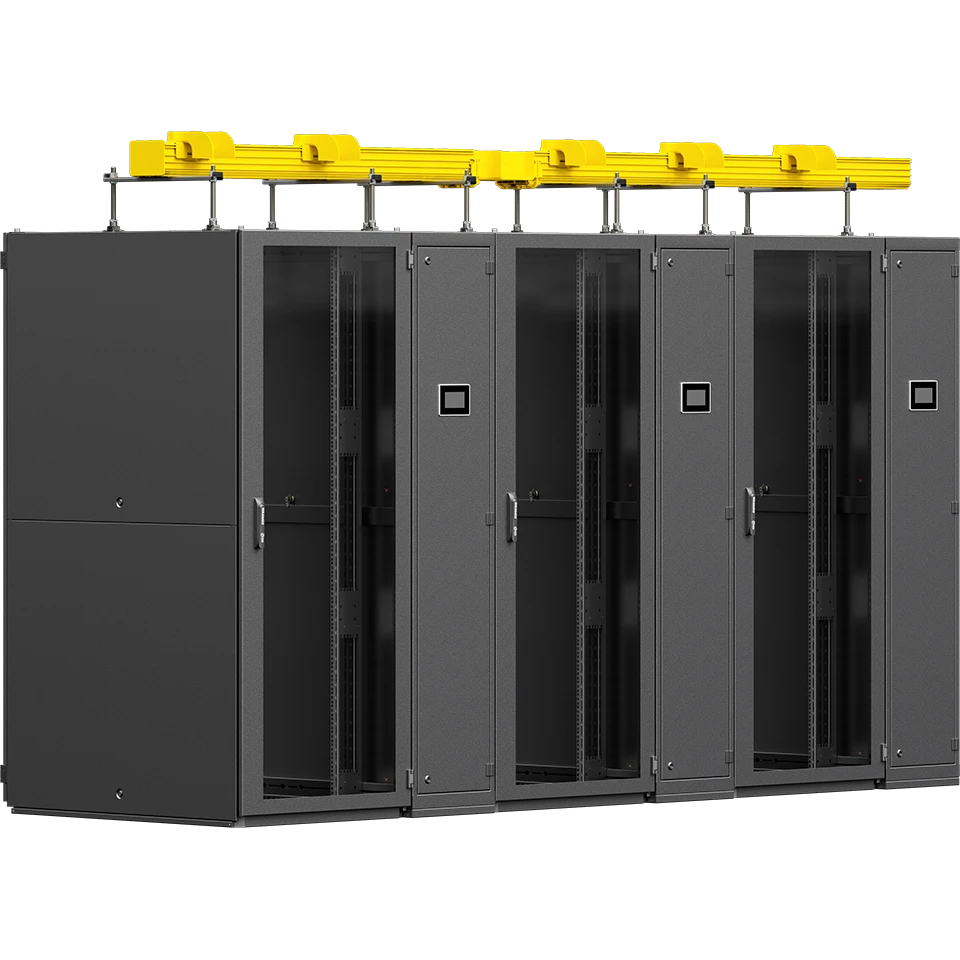 Les portes avant et arrière des baies sont en verre ou entièrement métalliques, ce qui crée un espace de circulation d'air fermé entre les serveurs et l'unité de refroidissement.