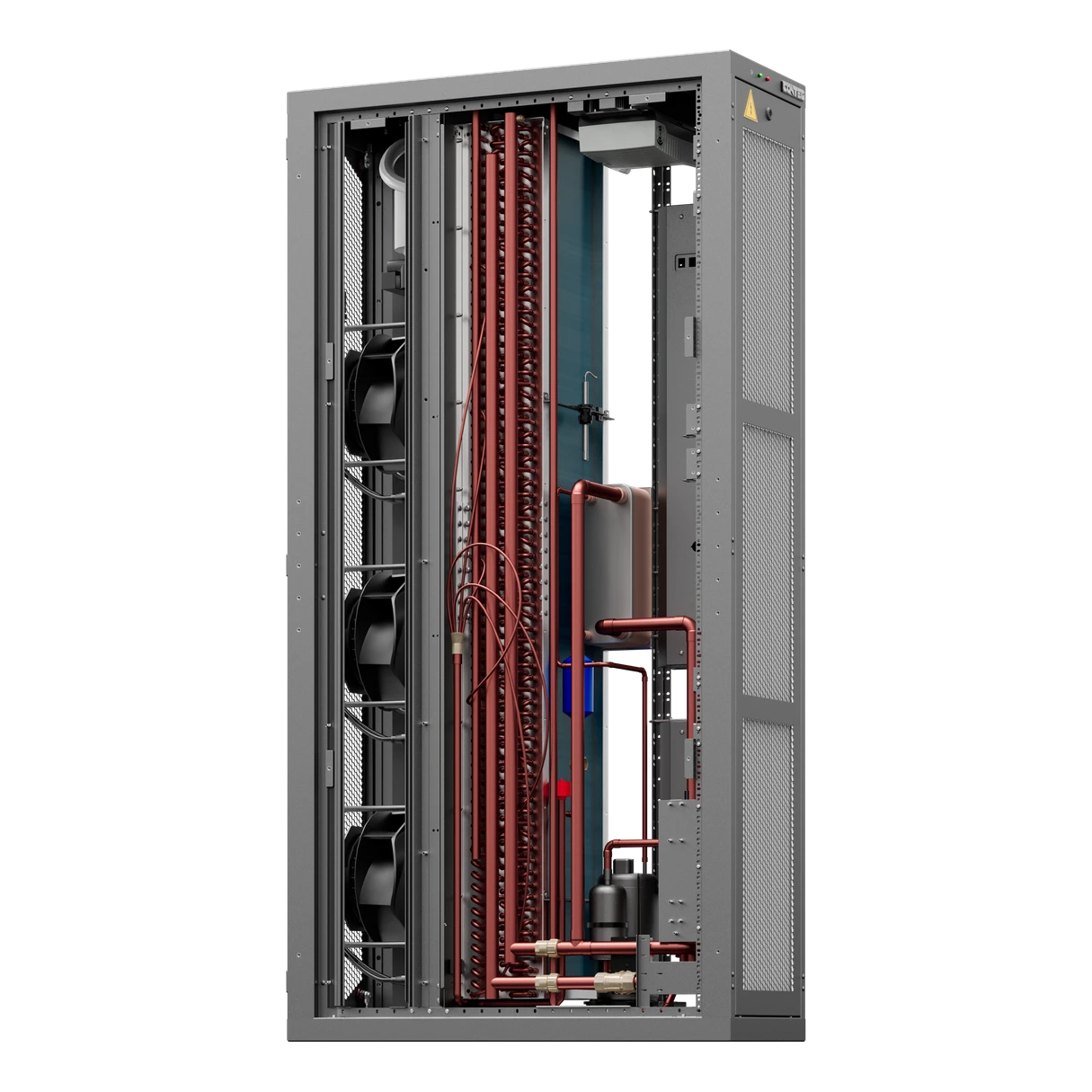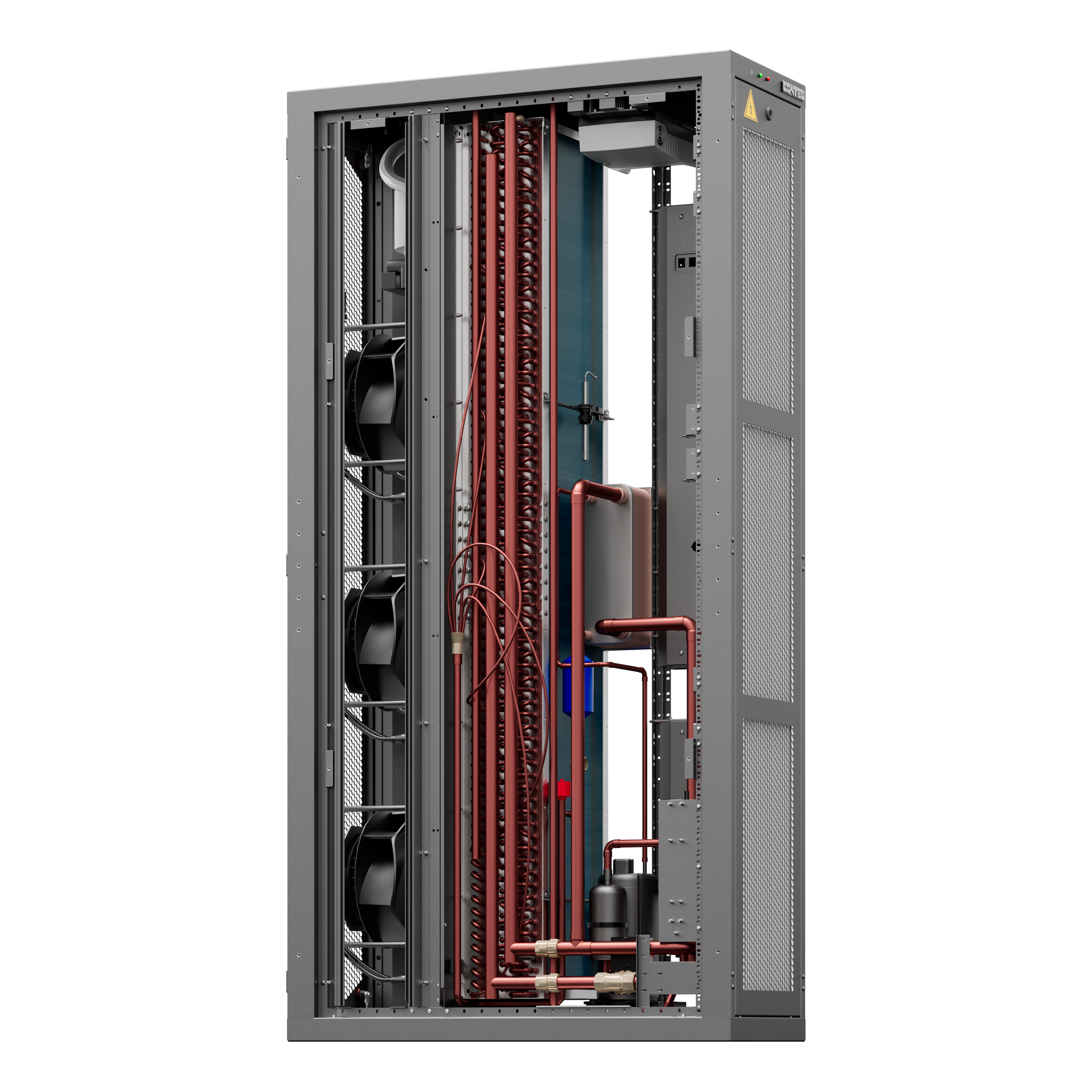 CoolTeg Plus DF is an inter-cabinet air conditioning unit based on an innovative two-liquid cooling technology combining water and compressor cooling. As such, the unit contains a unique, highly efficient heat exchanger that enables the use of free cooling. The key functional elements of the system are integrated in the indoor unit, and heat removal from the data center is realized by a hydraulic circuit. This circuit is connected to two branches within the unit – a water exchanger and a water-cooled condenser. The water exchanger is used mainly in winter at low outdoor temperatures, and the water-cooled condenser is used mainly in the summer months, when it is necessary to activate the compressor circuit. The unit operates in three different modes – free-cooling mode, compressor mode (direct vapor) and mixed (hybrid) mode, when both branches of the unit are actively involved, i.e., both the water and the compressor part.CoolTeg Plus DF40 – this unique cooling unit with a width of mere 40 cm and a maximum power of up to 24.5 kW can be connected to a hydraulic circuit (water-glycol) with a pump and an external dry cooler. A great advantage lies in the possibility to connect a single unit or multiple units to one hydraulic circuit, or to connect a group of units to one hydraulic circuit and another group to another hydraulic circuit, or to connect all units (or groups of units) to any number of hydraulic circuits - there are countless options to save acquisition costs or to increase redundancy of the data center cooling system.